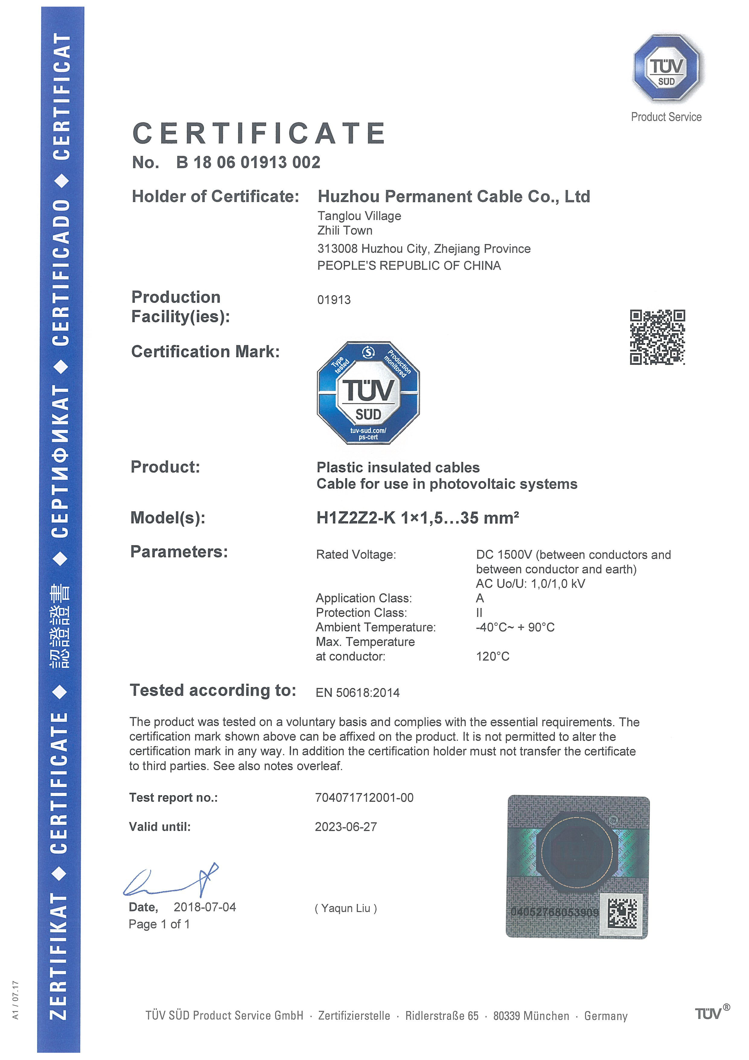 2016年--2018年,我司先后獲得了CE證書和TUV證書, 通過了SGS的第三方驗廠。2017年-2018年,2年的時間內(nèi),在新能源領域--光伏電纜, 取得了重大進步。